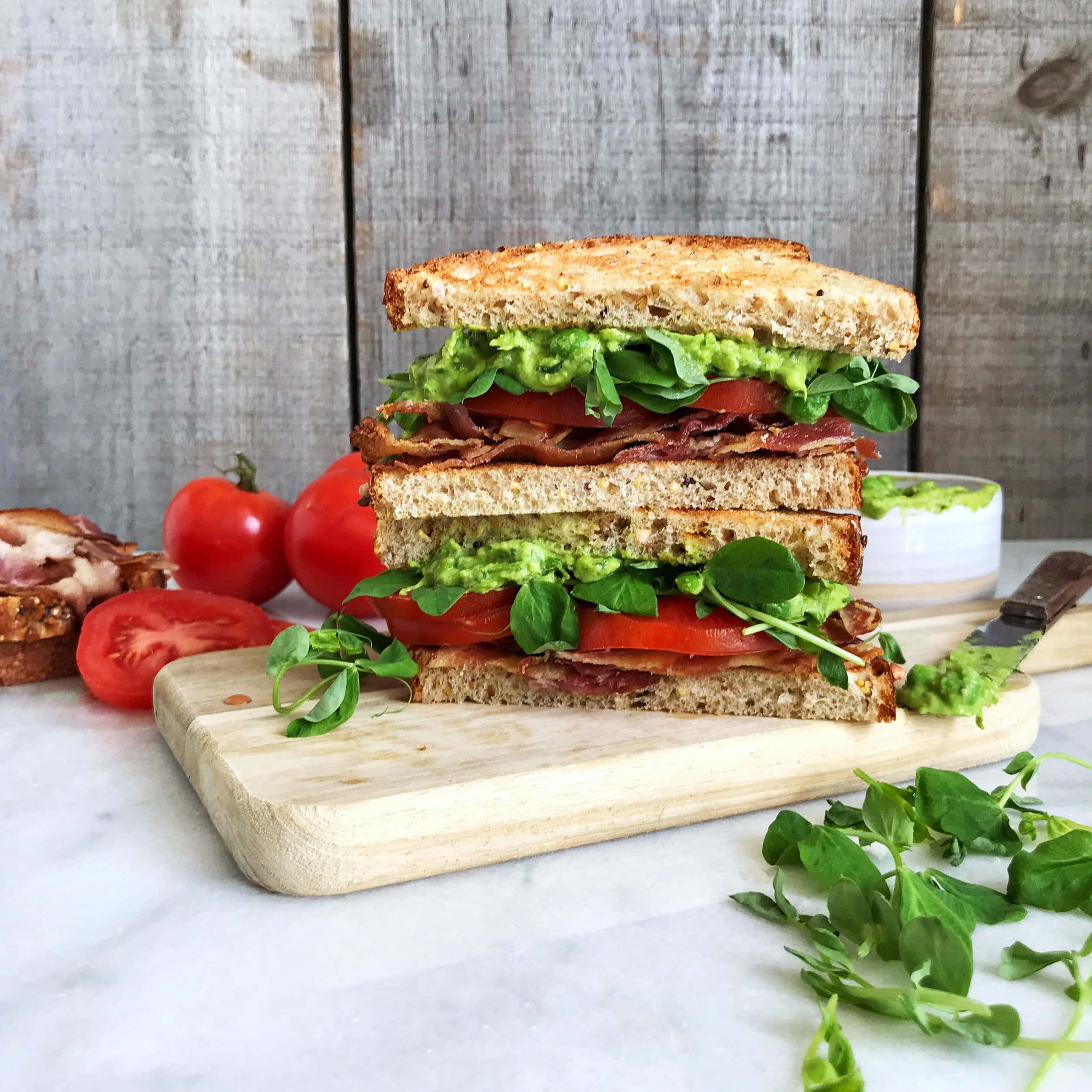 A twist on the classic BLT, this sandwich replaces the lettuce with GoodLeaf Sweet Pea Shoots and skips the mayo, using a healthier pea and avocado spread.